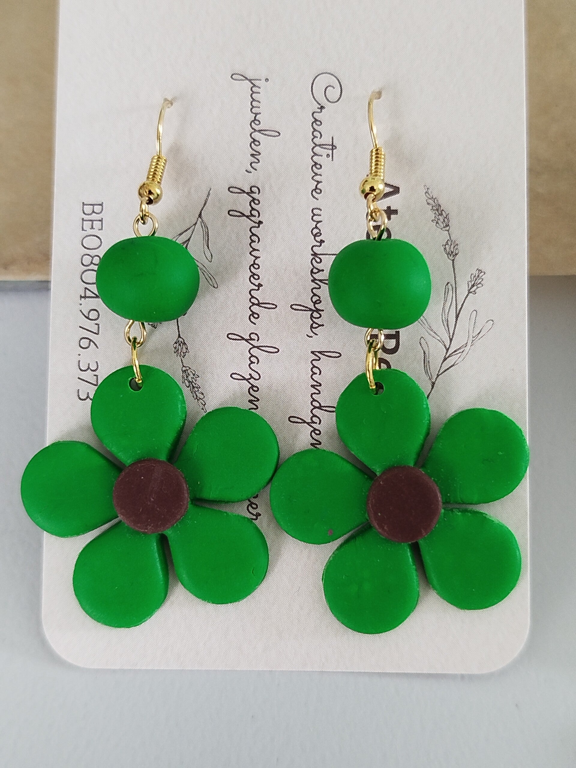 Groene bloem oorbellen, gemaakt uit polymeerklei.